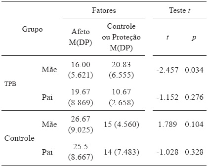 Para entender os efeitos da interação e especificar em quais das duas dimensões e em qual figura parental houve diferença entre os grupos, foi realizado um Teste t para amostras independentes, revelando assim uma diferença significativa no valor das médias da dimensão de afeto na figura parental da mãe (t [2.457] = 8.372, p = 0.034, d = 3.52). Estes resultados revelam que a dimensão de afeto da figura parental da mãe foi o principal fator de diferenciação entre os grupos com relação à escala IVP. A tabela 2 mostra a média dos escores das dimensões da escala IVP para o grupo com TPB e controle e os valores da comparação entre grupos.