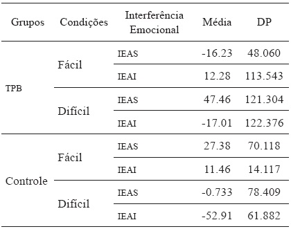 O experimento realizado gerou valores de IE para imagens sugestivas de apego seguro (IEAS) e de apego inseguro (IEAI). O Teste t aplicado nos escores da IEAS e da IEAI tanto na condição difícil quanto na condição fácil do experimento revelou que os resultados encontrados não foram significativamente diferentes de zero (p > .05), o que sugere que não houve um efeito de interferência das imagens sobre a resposta dos participantes. A tabela 3 mostra os valores do IEAS e da IEAI nas condições fácil e difícil entre os grupos.