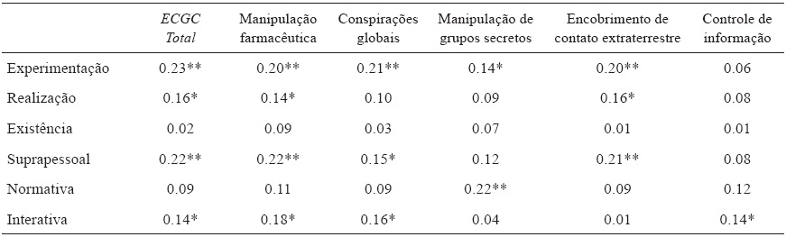 Inicialmente, com a finalidade de testar as hipóteses deste estudo, computou-se a pontuação total para a medida de crenças em teorias da conspiração, somando-se os 15 itens da escala. Posteriormente, calcularam-se as pontuações específicas desta medida, isto é, para cada um de seus cinco componentes, conforme indicado em instrumentos. Calculadas as pontuações totais de cada subfunção/valor básico, procurou-se correlacioná-las com aquelas de crenças em teorias da conspiração. Os resultados podem ser observados na tabela 1 a seguir.