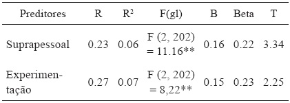 Os resultados indicaram que duas únicas subfunções (suprapessoal e experimentação) lograram explicar a variação em tais crenças [F (2, 202) = 8.22, p < 0.001; R² ajustado = 0.06]. Especifica-mente, estes valores contribuíram de forma positiva para a pontuação na dimensão geral de crenças em teorias da conspiração [suprapessoal (β = 0.22) e experimentação (β = 0.23)].
