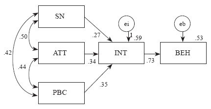 Note: SN: subjective norm; ATT: attitudes towards bicycle use; PBC = perceived behavioral control; INT= behavioral intention; BEH: bicycle use behavior. X2 (DF) = 1.33 (3), p > .05, GFI = 0.997; AGFI= 0.984; CFI = 1.000; NFI = 0.997; CMIN/DF = 0.478; RMSEA = 0.000; RMSR = 0.011.