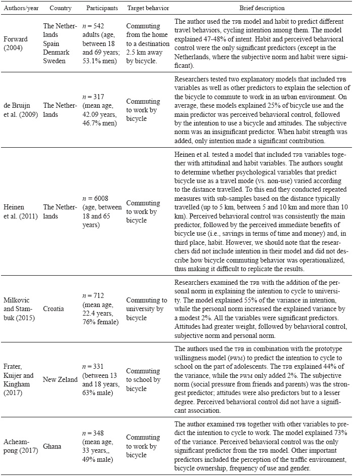 Table 1 summarizes previous studies that applied the TPB to the understanding of cycling behavior (Forward, 2004; de Bruijn et al., 2009; Heinen et al., 2011; Milkovic & Stambuk, 2015; Frater, Kuijer, & Kingham, 2017; Acheampong, 2017). In general, the TPB model explains, to a large extent, the behavioral intention and the behavior (explained variance from 25% to 73%). Furthermore, when other psychological variables are included (e.g. habit, personal norm), there is no observable significant increase in explained variance (Frater et al., 2017; Milkovic & Stambuk, 2015; de Bruijn et al., 2009). In terms of the relative importance of the model’s various components, the results varied. Only one study found significant effects for all of the model’s components (Milkovic & Stambuk, 2015). In other studies, perceived behavioral control seemed to be the component most consistently associated with behavior (Acheampong, 2017; Heinen et al., 2011; de Bruijn et al., 2009; Forward, 2004). Three of the seven studies found attitudes to be associated, and one of these found them to be the most important (Milkovic & Stambuk, 2015). Lastly, regarding the subjective norm, two studies identified it as a predictor, and it emerged as the most important in one about secondary school students (Frater et al., 2017). In any case, it is difficult to compare results across studies due to differences in methodology, the criteria being predicted (behavioral intention or the behavior itself) and the statistical focus used to evaluate the model (with all the variables placed at the same level or according to those levels proposed by the TPB).