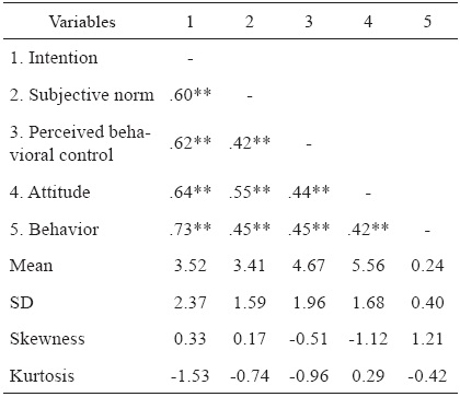 The analyses of correlations between TPB variables do not indicate the presence of multivariate collinearity, given that the values of the first were inferior to .85 (Kline, 2011). Table 2 shows moderate, positive and significant correlations between TPB variables and bicycle use behavior, and indicates that the strongest correlation exists with behavioral intention. Additionally, we observed positive, significant and moderate correlations between the remaining variables.