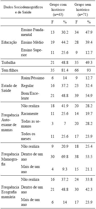 A amostra total (n=114) foi dividida em dois grupos: mulheres com histórico familiar de câncer de mama (HF) e mulheres sem o histórico familiar da doença (SHF) (n=71). No grupo HF (n= 43) as mulheres apresentavam idade média de 48.21 anos (DP=11.91), sendo que a maioria delas mulheres não possuía companheiro fixo, 62.8 % (n= 27). Entre o grupo, 51.2 % (n=22) apresentaram parentesco em primeiro grau (mãe e irmã) com familiares diagnosticadas com CM. Outras 48.8 % (n=21) referiram ser parentes em segundo e terceiro grau (avó, tia e prima). O diagnóstico e tratamento do familiar foi acompanhado por 55.8 % (n=24) das participantes, as quais, tinham em média 34.8 anos (DP=13, 49) nesta época. A idade da primeira mamografia das participantes do grupo foi aos 34, 95 anos (DP=8.42), com frequência média de realização anual 69.8 % (n=30).