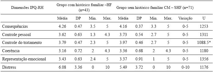 Com relação às dimensões da percepção da doença e ao distress, a tabela 2 apresenta os resultados descritivos (média e desvio padrão para cada grupo) e o teste U de Mann-Whitney para comparação dos resultados dos grupos HF e SHF.