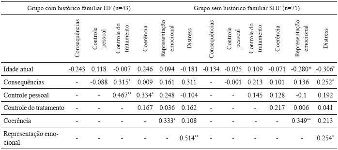 Foi realizada análise de correlação de Spearman para analisar as associações entre percepção da doença, distress e idade das mulheres, separadas por grupo. A idade atual da participante foi incluída como uma variável sociodemográfica que pode contribuir para as explicações adicionais sobre a formação das representações cognitivas das mulheres sobre o câncer de mama. A tabela 3 mostra os resultados.