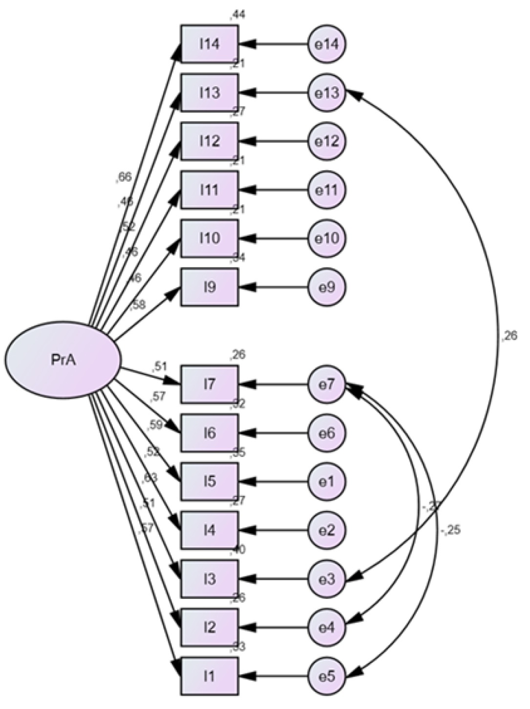 El modelo 2 agrupa 13 ítems en una única dimensión, para ello se excluyó el ítem 8 por presentar el menor valor de la escala total y, a su vez, se relacionaron algunos errores de medida (figura 1). Este modelo alcanza mejores indicadores de ajuste. Puede considerarse bueno que χ²/df fuera menor a dos. Los valores de RMR y RMSEA pueden considerarse de aceptables a buenos, ya que fueron menores a .08. Los indicadores CfI y TLI fueron mayores a.90, y estos valores pueden considerarse de aceptables a buenos.