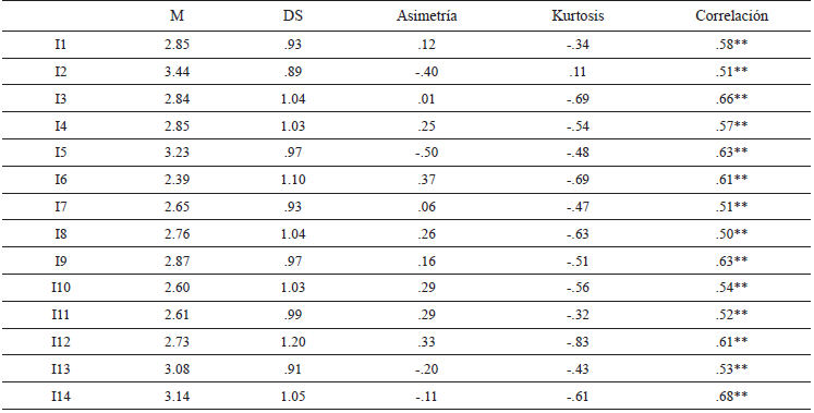 En la tabla 2 se presentan las medias, desviaciones estándar, valores de asimetría y kurtosis de cada ítem, además del valor de correlación con el total de la escala de PrA. En general, los ítems se comportan de forma aceptable a buena, con medias próximas a la media de la escala y desvíos estándar próximos a 1 (Carretero-Dios & Pérez, 2005). Todos los ítems superan el valor .30 de correlación con la escala total.