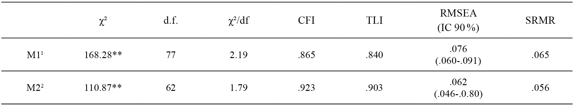 El modelo 1 agrupaba los 14 ítems en una sola dimensión. Presenta algunos indicadores de ajuste que pueden considerarse aceptables: χ²/df fue menor a tres, en tanto el RMR y el RMSEA fueron menores a .08. Sin embargo, los indicadores CfI y TLI no pueden considerarse de buen ajuste dado que sus valores fueron menores a .90.
