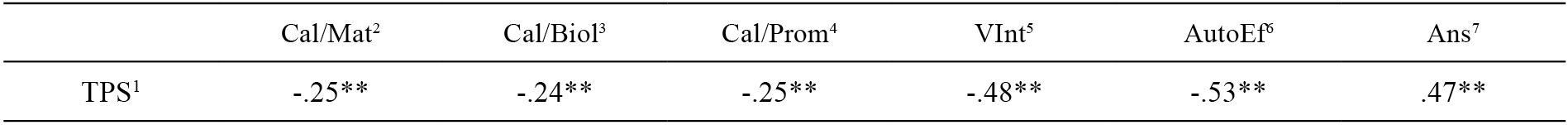 En la tabla 4 pueden observarse estadísticos descriptivos de las distintas variables que se consideraron para la validez de criterio. Se correlacionó la puntuación de la TPS con las medidas de rendimiento académico (calificación promedio, matemáticas y biología) y con los componentes motivacionales (autoeficacia, valor intrínseco y ansiedad ante las pruebas).