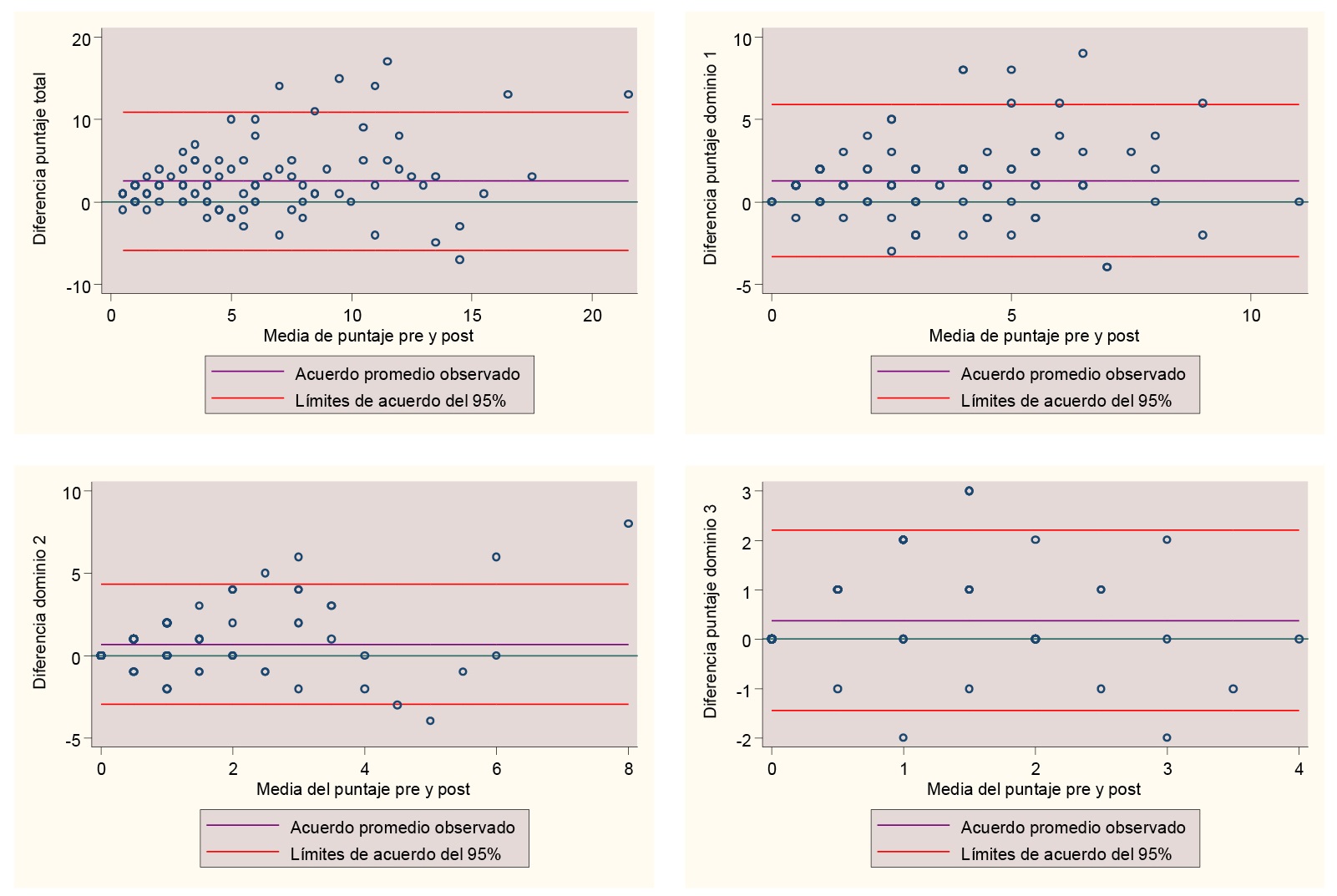 Según los límites de acuerdo de Bland y Altman para la DS-II total y para cada uno de los dominios, excepto para F3, a mayores puntajes tiende a presentarse menor grado de acuerdo entre las evaluaciones pre y post. En el caso del F3 el grado de acuerdo no parece relacionarse con la magnitud de la medición (figura 2).