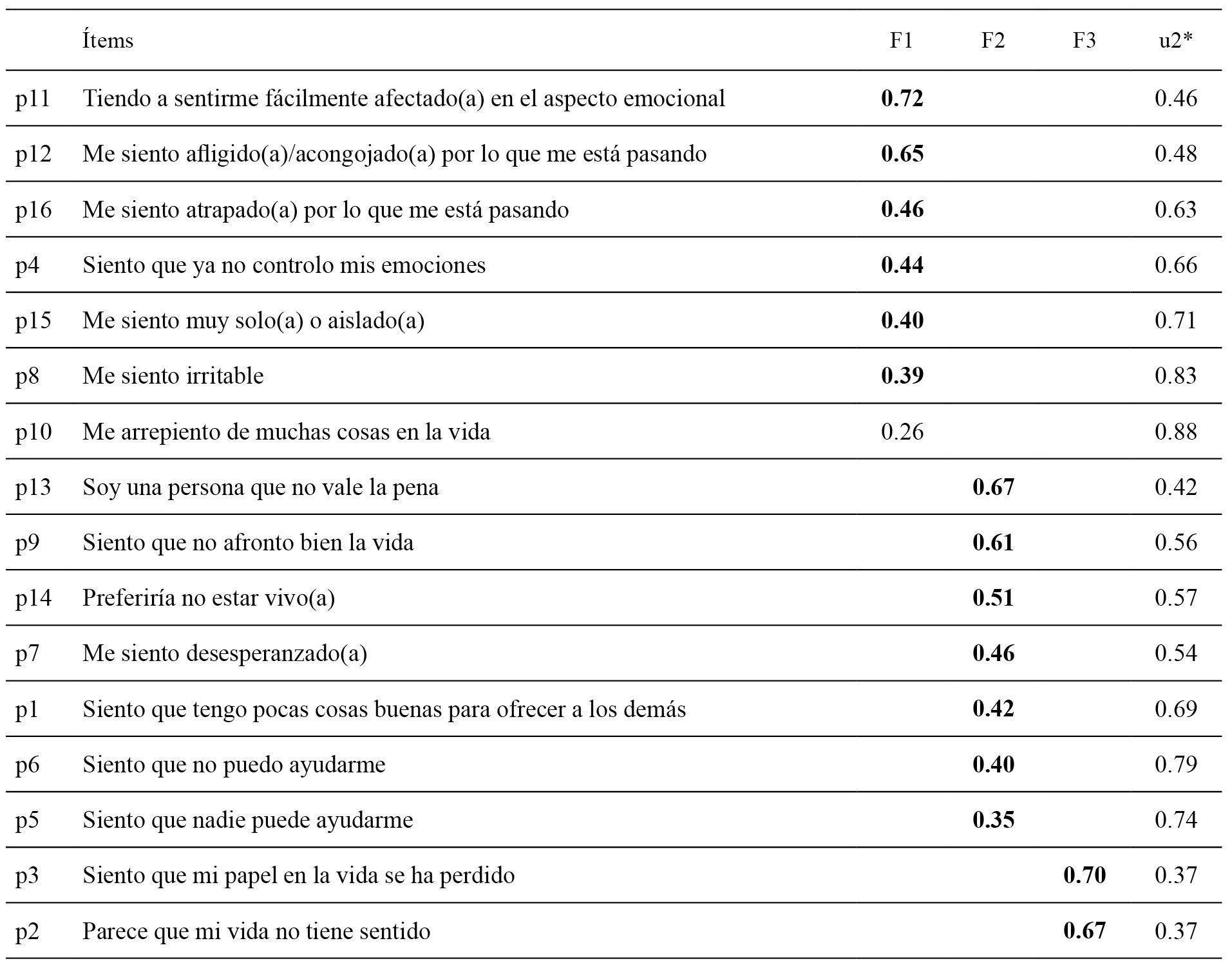 Análisis factorial exploratorio. Los resultados del test de esfericidad de Bartlett (χ. (120)= 2523.843, p< 0.0001) y del test KMO (KMO = 0.900) sugieren una adecuada estructura de la matriz de correlación. La estructura del gráfico de sedimentación de valores propios y test de análisis paralelo sugirió una solución óptima con 3 factores. La estructura con rotación ortogonal (varimax) fue la que ofreció una interpretación más consistente (tabla 1). Como puede observarse, el ítem 10 (p10 “Me arrepiento de muchas cosas en la vida”) no obtiene una adecuada carga factorial en ninguno de los tres dominios y muestra los valores de unicidad más altos. F1 representa falta de control emocional a través de seis ítems (p11, p12, p16, p4, p15, p8). F2 recoge características propias de sintomatología depresiva, representadas principalmente por ideación de desesperanza, minusvalía y muerte, a través de siete ítems (p13, p9, p14, p7, p1, p6, p5). F3 está representado solamente por dos ítems (p2 y p3) y se relaciona con aspectos del sentido de la vida.