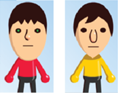 Todos los niños fueron entrevistados individualmente en un lugar silencioso en las instalaciones de cada colegio. La duración aproximada de cada entrevista fue de 12 minutos. Se siguió un procedimiento en cuatro fases, similar al procedimiento utilizado previamente por Baron et al. (2014). En la primera (fase de preferencia) se presentó a cada niño pares de dibujos de personajes ficticios con características humanas, todos ellos con rasgos diferentes (véase figura 1). Estos personajes fueron los mismos utilizados en la tercera fase del procedimiento. Las dimensiones de variación de las características fueron tipo de cabello, forma del rostro, boca, nariz y cejas. El objetivo fue dar la impresión a los niños de que cada personaje era un individuo diferenciado de los demás. Cada par se distinguía de manera constante en el color de la camiseta, uno con color rojo y el otro con color amarillo, así como en el color de ojos, uno de ojos verdes y el otro de ojos cafés. Se presentaron un total de cuatro pares de personajes, siempre contrastando los mismos colores de camiseta y ojos. Una vez se mostraba cada lámina en frente de cada participante, se formulaba la siguiente pregunta: “¿Podrías decirme cuál de ellos dos te gusta más?” Esto se hizo para indagar por posibles sesgos de preferencia por uno u otro personaje y tener una medición de comparación adicional a manera de pretest.