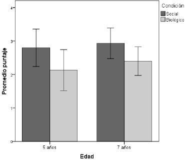Los análisis de los resultados de la fase de prueba se llevaron a cabo mediante modelos lineales generalizados (glm) para valorar el efecto de edad (cinco y siete años) y condición (social y biológico) con datos de resultados binarios. El modelo probado usó una distribución binomial de los resultados con una función de enlace logit. Análisis preliminares no encontraron un efecto significativo de la variable sexo, por lo tanto, esta se eliminó de los análisis subsecuentes. Los resultados revelaron únicamente un efecto estadísticamente significativo para la variable condición, Wald χ2 (1, n = 60) = 5.78, p = ,016. η2p = ,087 (véase figura 4.). Este efecto fue el resultado de un puntaje más alto para la condición social (m = 2.87, ds = ,97) que para la condición biológica (m = 2.27, ds = 1,01). Lo cual indica que ambos grupos de edad se comportaron de manera idéntica en el actual estudio, Wald χ2 (1, n = 60) = 0.6, p = 0.43. η2p = ,01, mostrando una mayor generalización inductiva en la condición social, de acuerdo con lo esperado. La interacción entre ambas variables no fue tampoco estadísticamente significativa, Wald χ2 (1, n = 60) = 0.38, p = 0.84. η2p = ,001.