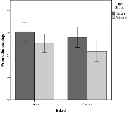 Los análisis de los resultados de la fase de prueba se llevaron a cabo mediante modelos lineales generalizados (glm) para valorar el efecto de edad (cinco y siete años), tipo de grupo social (natural y artificial) y nivel de cohesión (alta y baja). Análisis preliminares no encontraron efecto significativo de la variable sexo, por lo tanto, esta se eliminó de los análisis subsecuentes. Los resultados revelaron únicamente un efecto estadísticamente significativo para la variable tipo de grupo, Wald χ2 (1, n = 120) = 10.6, p = 0.01. η2 p = 0.056 (véase figura 5). Este efecto fue el resultado de un puntaje más alto para la condición grupo natural (m = 2.92, ds = 1.2) que para la condición grupo artificial (m = 2.3, ds = 1.2). Esto indica, primero, que ambos grupos de edad se comportaron nuevamente de manera idéntica en el actual estudio, Wald χ2 (1, n = 120) = 2.6, p = 0.11. η2 p = 0,01; y segundo, que la manipulación de la variable nivel de coalición no tuvo incidencia en el desempeño de los participantes, Wald χ2 (1, n = 120) = 0.47, p = 0.83. η2 p = 0.001. Ninguna de las interacciones fue tampoco estadísticamente significativa.