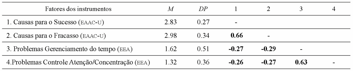 Conforme mostra a tabela 1, as correlações entre os fatores da EAAC-U e a EEA foram estatisticamente significativas, negativas e de pequena magnitude. Estes índices sugerem que a presença de atribuições de causalidade de localidade interna e controláveis tendem a diminuir o uso de estratégias autoprejudiciais nas situações de sucesso e fracasso acadêmico. Por sua vez, a correlação das atribuições causais para o sucesso e o fracasso apresentaram sentido positivo e grande magnitude. A correlação entre as estratégias autoprejudiciais, relativas aos problemas de gerenciamento do tempo e o controle da atenção e concentração também demonstrou sentido positivo e grande magnitude.