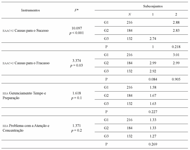 Para a comparação das atribuições de causalidade e das estratégias autoprejudiciais em razão das idades, os participantes foram agrupados por faixas etárias. Os critérios desta divisão foram pautados na análise de quartis. O primeiro grupo foi de estudantes com idades entre 18 e 20 anos (G1, n= 216); o segundo, agrupou os estudantes de 21 a 24 anos (G2, n = 184) e no último grupo foram incluídas as faixas etárias de 25 a 48 anos (G3, n = 132). Na sequência, compararam-se as diferenças de média nos dois instrumentos quanto aos grupos de diferentes idades por meio da análise da variância ANOVA, sendo solicitada a prova post hoc de Tukey para verificar a possível diferenciação em subgrupos de médias em ambas as medidas. Estes índices são reportados na tabela 2.