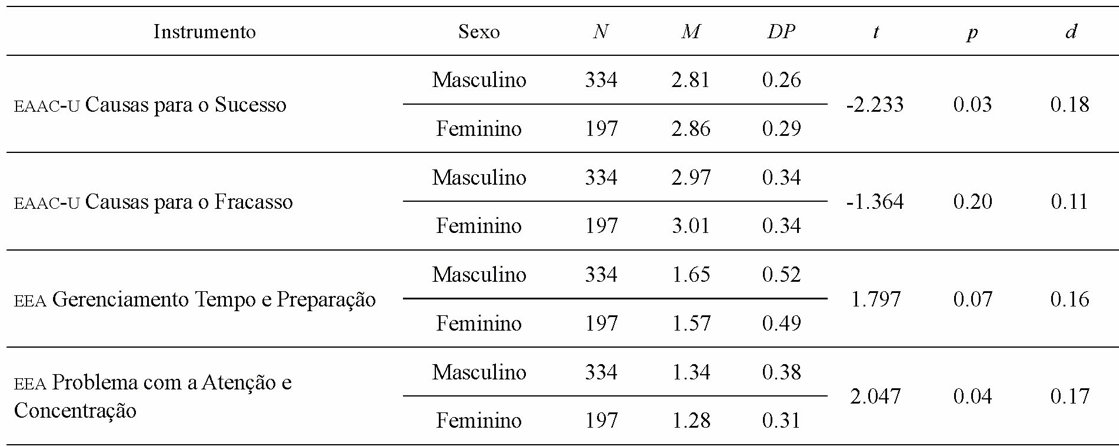 Nota-se, na tabela 3, que as estudantes do sexo feminino apresentaram maior média para o fator da EAAC-U Causas para o Sucesso (M = 2.86; DP = 0.29), indicativo de atribuições de causalidade de localidade mais interna e controláveis quando comparadas aos estudantes do sexo masculino (M = 2.81; DP = 0.26). Verificou-se, ainda, que as mulheres apresentaram menor uso da estratégia autoprejudicial aferida pelo fator da EEA Problema com Atenção e Concentração (M = 1.28; DP = 0.31) do que os homens (M = 1.34; DP = 0.38). A tabela 3 ainda reporta que as diferenças de médias identificadas nos fatores da EAAC-U Causas para o Fracasso e da EEA Problemas com o Gerenciamento do Tempo e Preparação não obtiveram significância estatística, podendo ser atribuídas ao acaso. Ademais, em ambos os instrumentos, os índices do d de Cohen demonstraram um tamanho de efeito estatístico trivial, visto que nenhum dos fatores atingiu o valor d = ou > 0.20.
