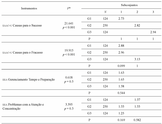 Em seguida, os estudantes foram divididos em três grupos de acordo com o seu CRA. Essa divisão foi feita com base na análise de quartis que considerou a pontuação mínima do CRA de 10 e a máxima de 96 pontos (M = 68.31; DP = 13.34). No G1 foram alocados os alunos com até 60 pontos (n = 124), no G2, os alunos entre 61 e 76 pontos (n = 250), e, no G3, acima de 77 pontos (n = 124). As diferenças de médias na EAAC-U e na EEA foram examinadas por meio da ANOVA e pela prova post hoc de Tukey. A tabela 4 apresenta os índices obtidos.