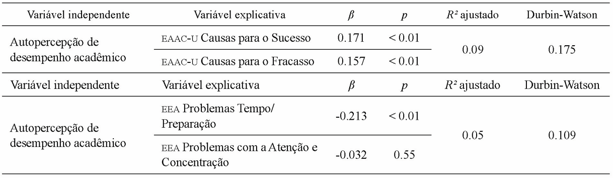 As estratégias autoprejudiciais, que aludem aos problemas com a gestão do tempo e planejamento para a execução das atividades explicaram 5 % da variância da autopercepção de desempenho acadêmico – F (2, 529) = 15.461 (p < 0.001). A cada um ponto de aumento desse tipo de estratégias autoprejudiciais observou-se um decréscimo de 0.213 pontos na autopercepção de desempenho acadêmico dos estudantes. As estratégias autoprejudiciais do Fator Problemas de Atenção e Concentração da EEA não apresentou significância estatística. Cabe frisar que o valor do Durbin-Watson próximo a 0 indica a existência de uma autocorrelação residual positiva, portanto, requer cautela quanto à plausibilidade do modelo testado (Goss-Sampson, 2020).