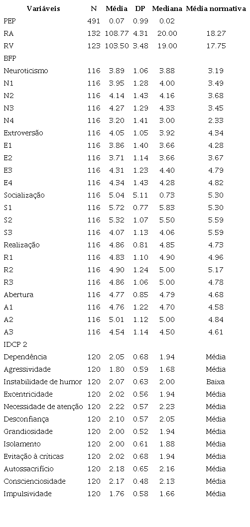 A análise de Shapiro-Wilk indicou que o PEP, RA, RV, os fatores Dependência, Agressividade, Instabilidade de Humor, Excentricidade, Desconfiança, Isolamento, Evitação à Críticas, Autossacrifício e Impulsividade do teste IDCP-2 e os fatores N1, N4, S1, S2, R1, R2, A2 da BFP não seguiram uma distribuição normal, enquanto os fatores Necessidade de Atenção, Grandiosidade e Conscienciosidade do IDCP-2 e os fatores N3, Neuroticismo, E1, E2, E3, E4, Extroversão, S3, Socialização, R3, Realização, A1, A3 e Abertura da BFP não seguiram uma distribuição normal.