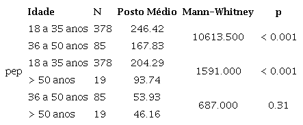 Os resultados também indicaram que houve diferença significativa nas médias no PEP entre os grupos de 18 a 35 anos e 36 a 50 anos (tamanho do efeito médio, d de Cohen = 0.46) e entre os grupos de 18 a 35 anos e >50 anos (tamanho do efeito médio, d de Cohen = 0.42). A tabela 3 apresenta os resultados encontrados para essa análise.