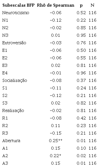 Para a quarta hipótese era esperado que ocorresse correlação leve entre o teste de percepção de emoções (PEP) e os fatores da personalidade (BFP). Pode-se observar os resultados das análises na tabela 4. Os resultados indicaram que a maioria das correlações não foram estatisticamente significativas, havendo correlação significativa positiva e leve apenas entre o PEP e o fator Abertura (r = 0.25, p = 0.01) e o sub-fator A2 - Liberalismo (r = 0.22, p = 0.02).