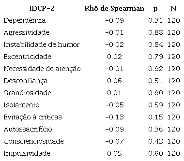 Os resultados apontados indicaram que não houve correlação significativa entre o teste de percepção de emoções primárias (PEP) e traços patológicos de personalidade (IDCP-2).