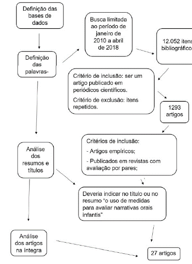 Na terceira etapa, as buscas foram realizadas. Essa busca resultou em 12.052 itens bibliográficos. Em seguida, os critérios de inclusão estabelecidos foram aplicados. Assim, somente artigos (1) empíricos, (2) publicados em revistas com avaliação por pares, (3) que indicassem, no título ou no resumo, o uso de medidas para avaliar narrativas orais infantis e (4) limitado ao período de 2010 a 2018 foram selecionados. O resultado das análises preliminares com base nos critérios de inclusão chegou a um total de 27 artigos que constituíram o material de análise do presente estudo.1 A figura 1 mostra o fluxograma dos passos descritos acima.