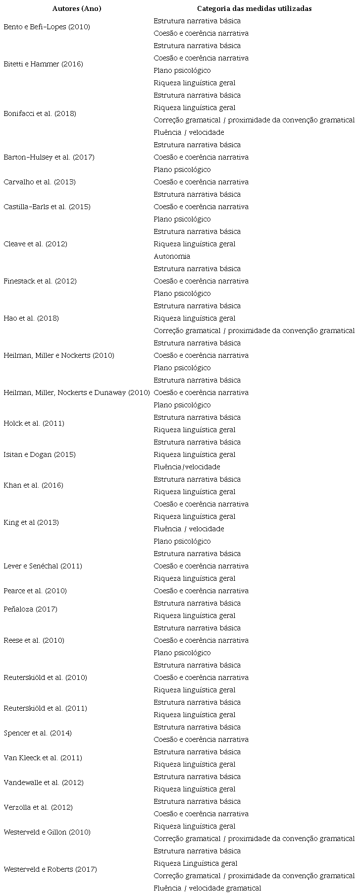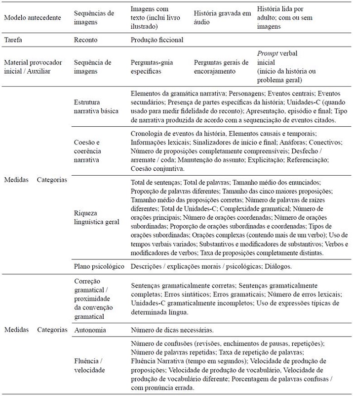 Propomos, ainda, uma subclassificação das Medidas de Qualidade Narrativa que visa organizar e dar maior inteligibilidade à imensa variedade de critérios utilizados para avaliar narrativas orais. Uma análise das habilidades que são sondadas por cada medida nos levou à proposição de sete categorias, que também podem ser vistas na tabela 2: (1) Estrutura narrativa básica: o esqueleto da história, comumente compreendendo o enredo da narrativa; (2) Coesão e coerência narrativa: elementos usados para dar sentido à unidade narrativa; (3) Riqueza linguística geral: diversidade, quantidade e/ou complexidade de elementos linguísticos; (4) Plano psicológico: elementos narrativos que se sobressaem ao enredo ou à estrutura narrativa básica, indicando sentimentos, intenções, características, interações e motivações dos personagens; (5) Correção gramatical / proximidade da convenção gramatical: adequação das estruturas linguísticas; (6) Autonomia: quantidade de ajuda que a criança precisa para construir ou reconstruir sua narrativa (7) Fluência / velocidade: fluidez ou facilidade com que a criança narra a história.