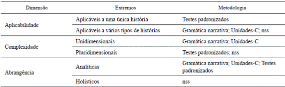 O primeiro critério é o de aplicabilidade. Algumas metodologias estão ancoradas em um tipo de narrativa específica e não podem ser adaptadas às variadas formas de narrativas orais, enquanto outras são aplicáveis a uma gama mais ou menos ampla de tipos de narrativas, conforme exemplos na tabela 1.