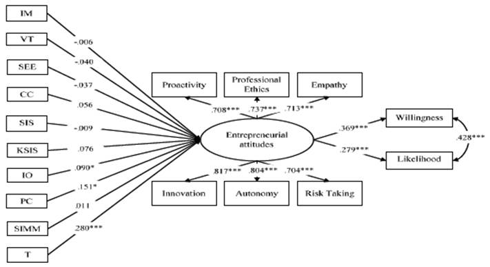 Figure 2 shows the MIMIC model. Results of the model pointed to an excellent overall fit: X2(89)= 150285 (p<.001), CFI=.967; RMSEA=.036 [.026, .046]. When the analytical fit was examined, the measurement showed that one factor did appropriately represent the six entrepreneurial attitudes with statistically significant, positive and high factor loadings for each of them: .708 for proactivity, .737 for professional ethics, .713 for empathy, .817 for innovation, .804 for autonomy, and .704 for risk taking.