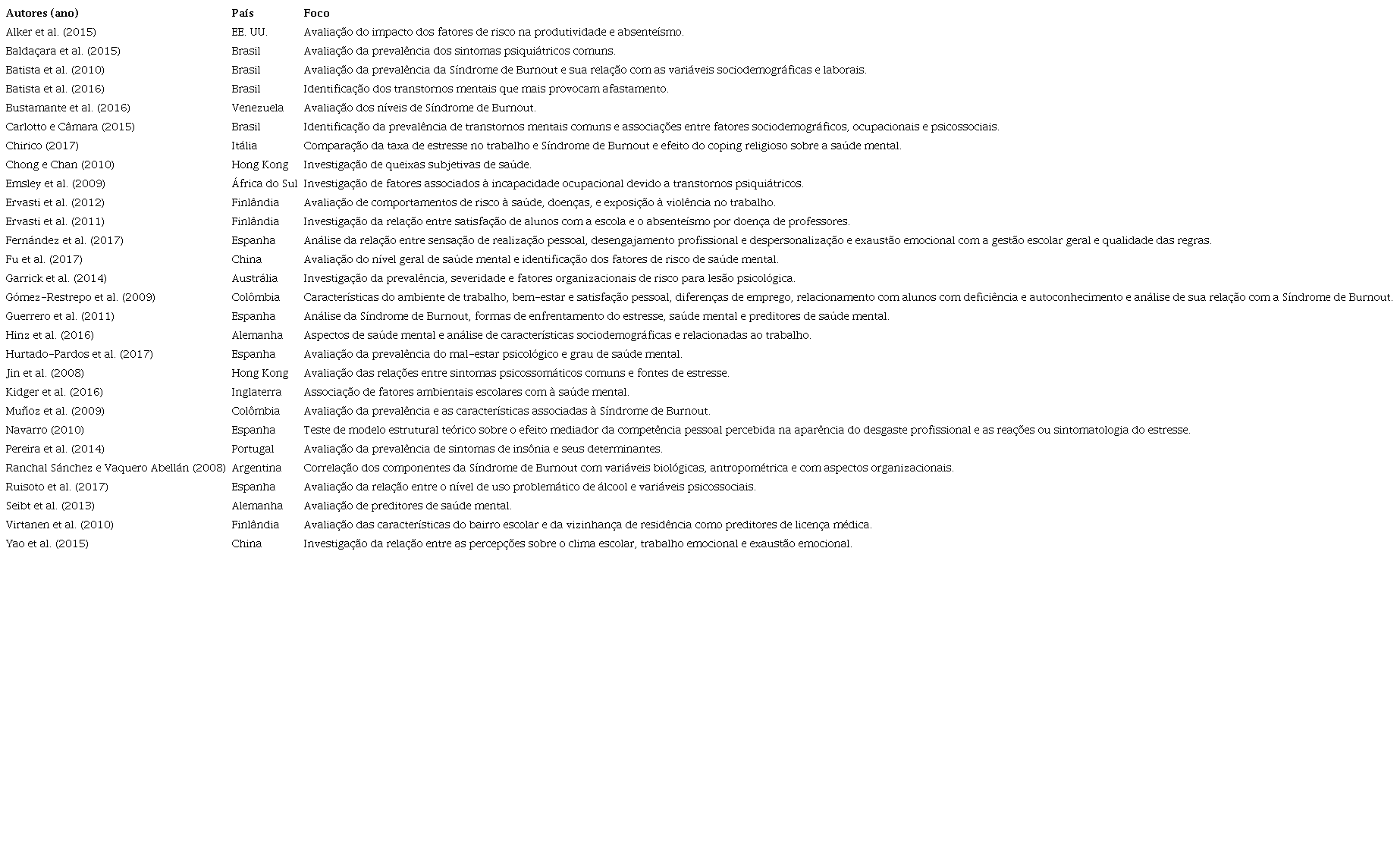 Quanto aos fatores de risco psicossociais ocupacionais, seja aqui no país quanto no exterior, foi possível identificar: ambiguidade do papel, insatisfação no trabalho, baixos níveis de apoio social, autonomia e autoeficácia percebida, exposição a algum tipo de violência, problemas com alunos, cultura escolar deficiente, más condições de trabalho, número sobressalente de alunos em sala de aula e sobrecarga de trabalho e estão associados com transtornos mentais que têm resultado em incapacidade para o trabalho, licenças por doenças, perda de produtividade e de qualidade de vida (Alker et al., 2015; Batista et al., 2010; Carlotto & Câmara, 2015; Fernández et al., 2017; Fu et al., 2017; Muñoz, 2009; Ruisoto et al., 2017).