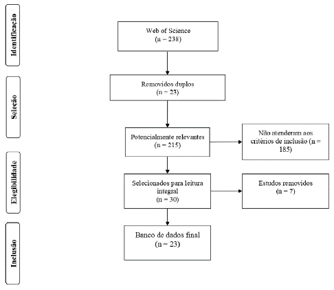 Duas pesquisadoras dedicaram-se ao processo de análise dos artigos a partir dos critérios de inclusão anteriormente propostos. Nos casos em que houve discordância entre as pesquisadoras, a decisão por incluir ou não o estudo foi tomada em consenso. Assim, dos 215 artigos inicialmente selecionados, 185 foram excluídos por não se enquadrarem nesses critérios. Os 30 estudos restantes foram submetidos a uma nova análise, considerando suas temáticas. Destes, outros 7 artigos foram descartados por abordarem temáticas alheias à conjugalidade em associação com a privação de liberdade, a saber: declínio nas taxas de casamento no contexto norteamericano, questões relacionadas à reincidência (sem interlocução com o casamento), questões referentes a situações de pobreza e vulnerabilidade social e transmissão de doenças sexualmente transmissíveis no encarceramento (também, sem interlocução com a conjugalidade). Restaram, então, 23 artigos. Os procedimentos de busca e seleção dos estudos estão ilustrados na Figura 1.