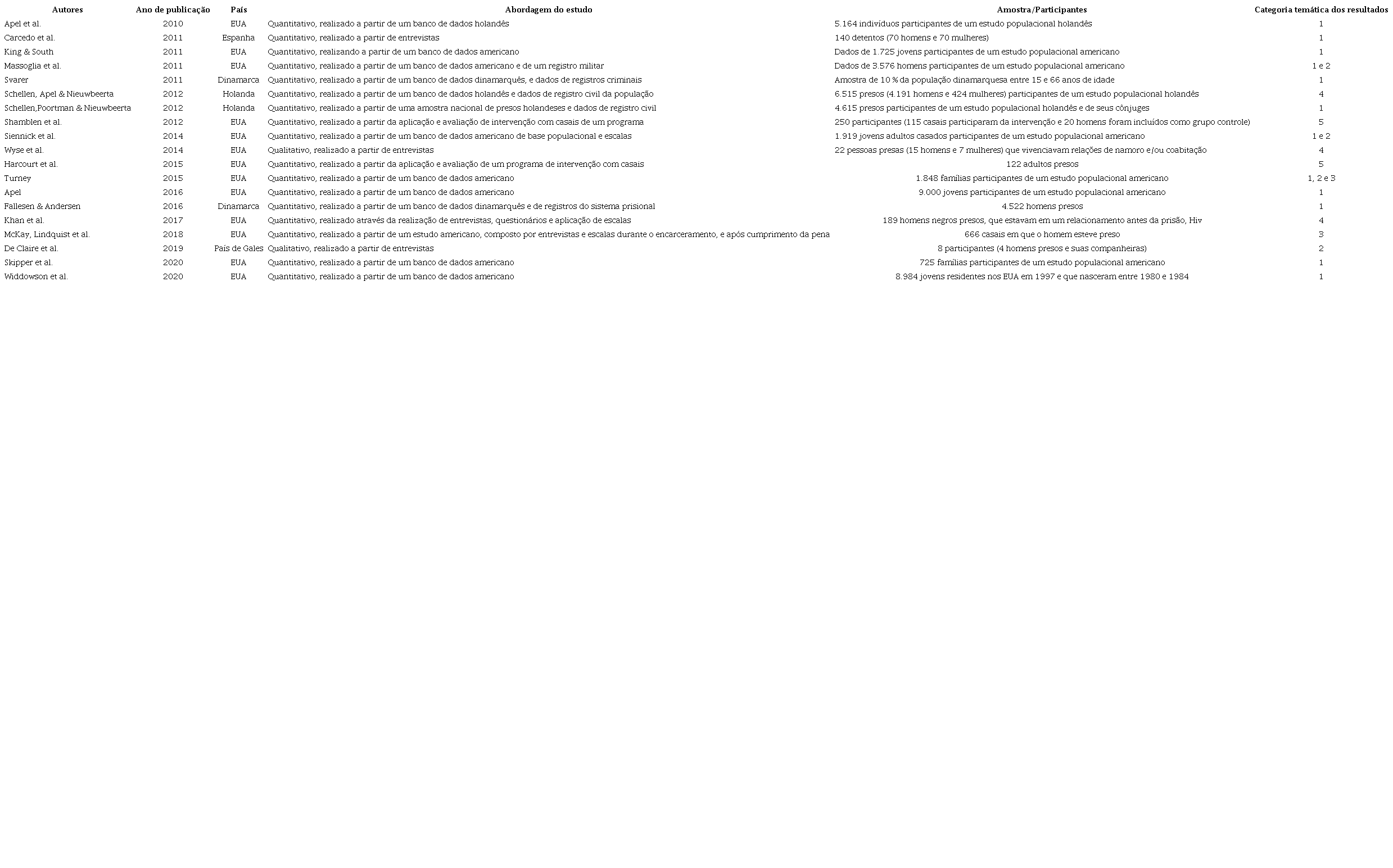 Sobre o tipo de abordagem utilizada nos estudos analisados, as pesquisas de caráter quantitativo foram as mais prevalentes (87 %), ao passo que apenas dois artigos utilizaram o delineamento qualitativo (9 %), e um o método misto (quantitativo e qualitativo) (4 %). Dos estudos quantitativos, a maior parte (14 estudos), além do estudo misto, utilizaram dados provenientes de grandes amostras populacionais para a análise das variáveis de interesse. As amostras utilizadas foram: National Longitudinal Survey of Youth 1997 (amostra proveniente dos EUA), que embasou os resultados de quatro estudos (26.7 %), seguido pelo banco de dados holandês Criminal Career and Life-course Study (COLS), e pela amostra americana Multi-Site Family Study of Incarceration, Parenting and Partnering (MFS-IP), cada uma utilizada por três artigos (20 %). O cadastro populacional dinamarquês Statistics Denmark, e os dados da amostra nacional americana The Fragile Families and Child Wellbeing Study embasaram a realização de dois estudos (13.3 %), cada um. Outra publicação utilizou a base de dados americana National Longitudinal Study of Adolescent Health (Add Health), correspondendo a 6.7 % dos artigos. Alguns estudos também utilizaram amostras combinadas, a exemplo do estudo de Massoglia et al. (2011) que, além do National Longitudinal Survey of Youth 1997, utilizou o Survey ofOfficer and Enlisted Personnel, um registro militar norte-americano, ao passo que outros estudos se embasaram em dados do sistema prisional (Fallesen & Andersen, 2016; Svarer, 2011), e de registro civil da população (Schellen, Apel & Nieuwbeerta, 2012; Schellen, Poortman & Nieuwbeerta, 2012). É necessário considerar, então, ao interpretar os resultados aqui descritos, que as amostras se repetem, visto que diferentes estudos utilizaram as mesmas bases de dados para analisar as variáveis propostas. Ademais, que são estudos secundários, sendo que o fato de estes não terem acessado diretamente as pessoas, mas dados mais amplos sobre suas vivências, precisa ser também considerado.