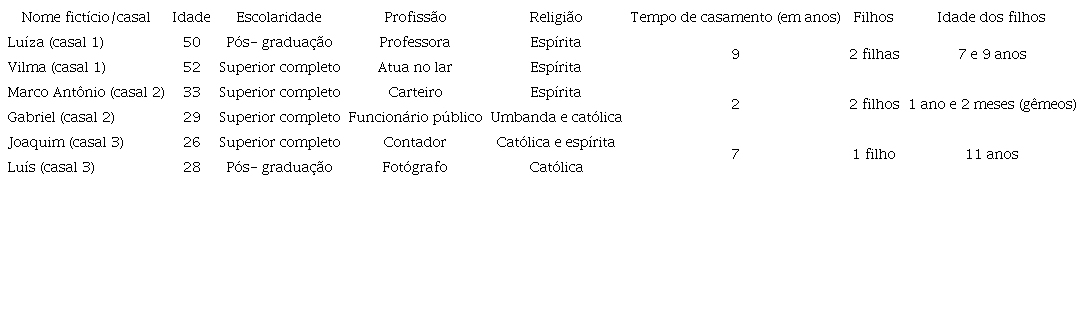 Os casais entrevistados foram contatados a partir de um grupo de apoio à adoção localizado em um município de médio porte do interior do estado de Minas Gerais (Brasil). Este grupo faz parte de uma rede maior, integrando diferentes municípios da região. A pesquisadora responsável pela coleta de dados fazia parte desse grupo, ocupando a função de psicóloga voluntária para a orientação de pretendentes à adoção no município. Embora ocupasse essa função à época da coleta de dados, não havia tido contato prévio com os participantes. O casal número 1, formado por duas mulheres, foi um dos primeiros inseridos no contexto de habilitação da adoção na cidade. Adotaram duas meninas negras, sendo a primeira adoção de uma menina de dois anos e quatro meses, estando com sete anos no momento da pesquisa. A segunda adoção foi de uma menina de seis anos e oito meses, com nove anos há época da coleta de dados. O casal número 2, formado por dois homens, tem dois filhos gêmeos de um ano e dois meses, sendo que a adoção ocorreu quando as crianças estavam com 11 meses. Uma das crianças possui diagnóstico de paralisia cerebral e requer cuidados de uma equipe de saúde (fisioterapia e fonoaudiologia), sendo alimentada por sonda. O casal número 3, formado por dois homens, relatou que passou pelo processo de habilitação para a adoção em média de dois anos até o processo de guarda da criança, adotada com 11 anos de idade.