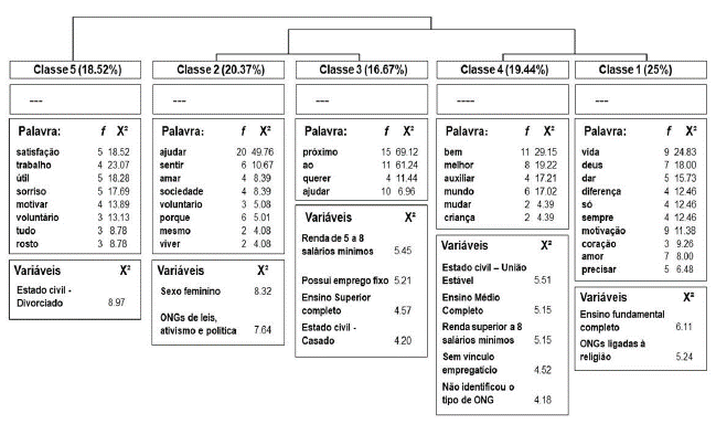 Ao se analisar as características sociodemo-gráficas e contextos de atuação voluntária (tipo de instituição), foram encontradas cinco classes lexicais que explicitam quais as motivações em jogo: religiosa, fraternal, altruísta, transformadora e pessoal. Destacamos a Motivação religiosa como um conteúdo que não compareceu declaradamente em modelos muito utilizados na produção acadêmica brasileira e lusófona (Cavalcante, 2012; Ferreira et al., 2008).