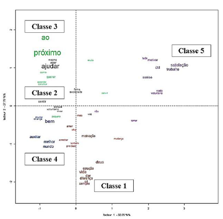 Solicitada a Análise Fatorial de Correspondências (AFC), foi possível observar relações de proximidade ou heterogeneidade entre as classes encontradas na CHD (Figura 2). A análise gera um plano de quatro quadrantes nos quais se posicionam as palavras que demarcam as classes lexicais. Nota-se uma maior proximidade de contextos enunciativos entre as Classes 2 e 4 (Motivação fraternal e Motivação transformadora). A Classe 3 (Motivação altruísta) se opõe à Classe 1 (Motivação religiosa), ao passo que a Classe 5 (Motivação pessoal) se mantém afastada de todas as outras, indicando contextos enunciativos mais distanciados dos demais.