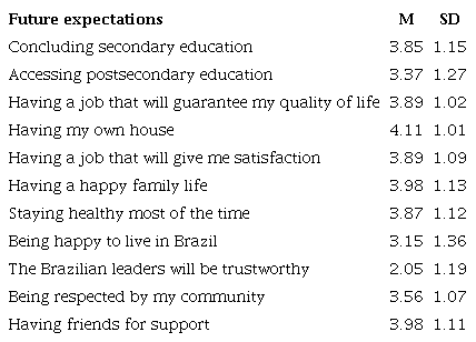 The future expectation scale had an internal consistency ratio of 0.804 and a total average of 39.70, ranging from 11 to 55 points. The mean item scores are shown in Table 1. The highest mean was related to the expectation of having a house of their own, followed by the expectation of having a happy family life and friends for support. The lowest expectations for the future were to enter university, be respected in their community, be happy to live in Brazil, and that the country's leaders will be trustworthy in the future. The latter obtained the lowest average score and was the only item that scored below three points.