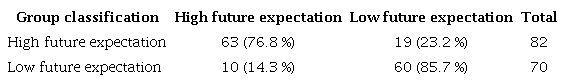 Initially, descriptive analyses were performed to examine the sample characteristics and the results of the future expectation scale. Subsequently, the data were evaluated using multivariate analysis to identify profile characteristics that significantly distinguished two groups: adolescents with high expectations for the future and adolescents with low expectations for the future. We applied the discriminant analysis, a statistical procedure that classifies unknown individuals and the probability of their classification into a certain group. To obtain greater differentiation between the groups and increase the discriminant power, we chose to divide the total sample (N = 190) into three parts, based on the scores of the future expectation scale, using the percentages 40 and 60 as cutoff points. The first group (G1) included the 40 % with the lowest scores, the second group (G2) comprised the 40 % with the highest scores, and the remaining 20 % with average scores were excluded. Therefore, in the multivariate analysis stage, the sample consisted of 152 valid cases, 70 cases in G1 -adolescents with low expectations for the future- and 82 cases in G2 -adolescents with high expectations for the future-. Statistical analyses were performed using SPSS software version 20.