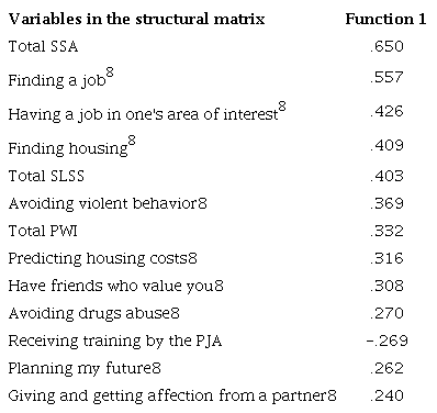 Discriminant analysis was used to know the relevant variables to distinguish two groups of adolescents in residential care with higher and lower scores on the future expectation scale. The function explains 100 % of the variability between G1 and G2, with a moderate canonical correlation of 0.650. The eigenvalue was 0.732. Based on the Wilks Lambda coefficient, we can infer that the function explains 42.3 % of the existing variance (1 - Wilks). The function had a good predictive ability, correctly classifying 80.9 % of cases (Table 2). The group with low future expectations presented a centroid of -0.785 against 0.920 in the group with high future expectations. The centroids reveal the situation of each group (high and low expectations), indicating their position in relation to the function found.