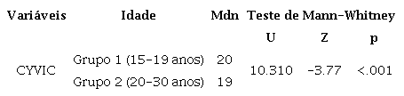 Uma vez que a variável relativa à ciberviti-mização não segue uma distribuição normal, foi realizado um teste não paramétrico (U de Mann-Whitney) para comparar a cibervitimização em função da idade (tabela 3).