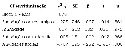 Através da análise individual do contributo de cada uma das variáveis independentes, verificou-se que apenas a variável Atividades sociais (β = -.707) contribuiu de forma estatisticamente significativa e negativa (p < .001) para o modelo, enquanto preditora da cibervitimização.