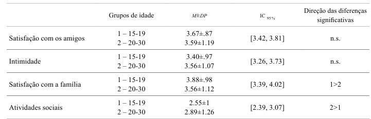 No sentido de verificar até que ponto a satisfação com o suporte social varia em função da idade, foram criados dois grupos etários -os adolescentes (dos 15 aos 19 anos) e os jovens adultos (dos 20 aos 30 anos)- e realizada uma análise de variância multivariada (MANOVA) (tabela 2). De acordo com os resultados observados, verificou-se a existência de uma diferença estatisticamente significativa entre os adolescentes e os jovens adultos em relação à satisfação com o suporte social, F (4, 341) = 6.99,p <. 001, Lambda de Wilks = .92; ƞ2 = .08. Quando os resultados da variável dependente foram considerados independentemente, verificaram-se diferenças a um nível estatisticamente significativo para a satisfação com a família, F (1, 344) = 7.61, p = .006, ƞ2 = .02 e para a satisfação com as atividades sociais, F (1, 344) = 7.82, p = .005, ƞ2 = .02. A análise dos valores médios indica que os adolescentes mostram uma maior satisfação com a família (M = 3.88; DF =.98) do que os jovens adultos (M = 3.56; DF = 1.12), ao passo que estes, por sua vez, apresentam uma maior satisfação com as atividades sociais (M = 2.89; DF = 1.26) comparativamente com os adolescentes (M = 2.55; DF = 1).