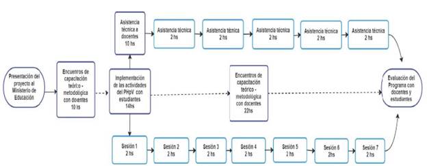 En primer lugar, se explicaron los objetivos del trabajo a las autoridades del Ministerio de Educación de la Provincia de Córdoba e instituciones escolares, y se acordaron las etapas a ejecutar. En un segundo momento, se dio inició a los encuentros de capacitación teórico-metodológica con los docentes que participaron de la implementación del PHpV cumpliéndose un total de 32 horas. En tercera instancia, los docentes efectuaron cada una las actividades del PHpV con los alumnos, a lo largo de siete sesiones de dos horas cada una en el horario destinado al dictado de su materia, como también en el horario de otras asignaturas y horas libres. Así mismo, los docentes tuvieron un total de 10 horas de asistencia técnica por parte del equipo de investigación. Las actividades realizadas por los docentes fueron ad honorem y certificadas con puntaje docente por el Ministerio de Educación.