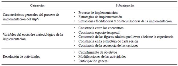 Así, siguiendo a Bteddini et al. (2017), se realizó un análisis cuantitativo de frecuencia por actividad y curso, evaluándose el cumplimiento de los objetivos de cada actividad de acuerdo a los indicadores y su configuración en los modelos construidos. Los objetivos principales del programa fueron abordados en seis sesiones y los secundarios en una sola sesión. Se presentan en la tabla 1 las categorías y subcategorías construidas.