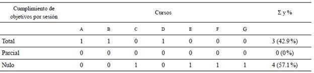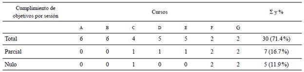 Cumplimiento de objetivos. A continuación se presenta la frecuencia del cumplimiento de los propósitos especificados por curso y objetivos (principales y secundarios). Como se visualiza en la tabla 2 a nivel general, de las 42 sesiones totales realizadas en los siete cursos donde se trabajaron los objetivos principales (A, B, C, D, E, F, G), en 30 sesiones los objetivos se cumplieron de manera total (71.4 %), en siete sesiones de modo parcial (16.7 %) y en cinco sesiones de forma nula (11.9 %).