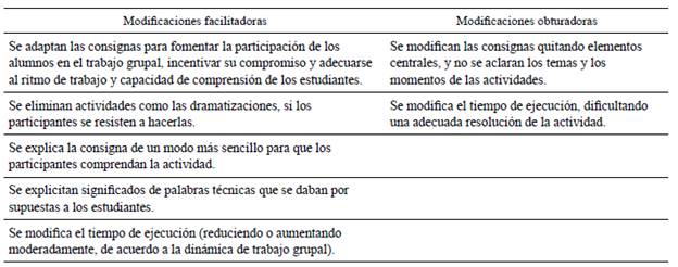 Modificación de las actividades. Si bien en su mayoría las actividades se ejecutaron acorde a la planificación original, se realizó un trabajo de adaptación cultural del programa durante su implementación, a fin de mejorar la comprensión de las consignas con base en las sugerencias de los docentes efectores. Se especifican a continuación las situaciones que facilitaron y obturaron el desarrollo de las actividades (véase tabla 4).