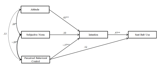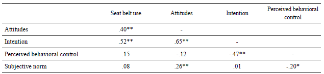 Table 5 shows the Pearson correlations between self-reported seat belt use and TPB constructs. The correlations are partially in line with the expectations of the theory. As can be seen, use intention is mainly related to behavior. Intention, in turn, is strongly associated with attitudes and with perceived behavioral control to a lesser extent. The subjective norm is not related to intention, although it shows low associations with attitudes and perceived behavioral control. Lastly, no statistically appreciable associations were observed between attitudes and perceived behavioral control.