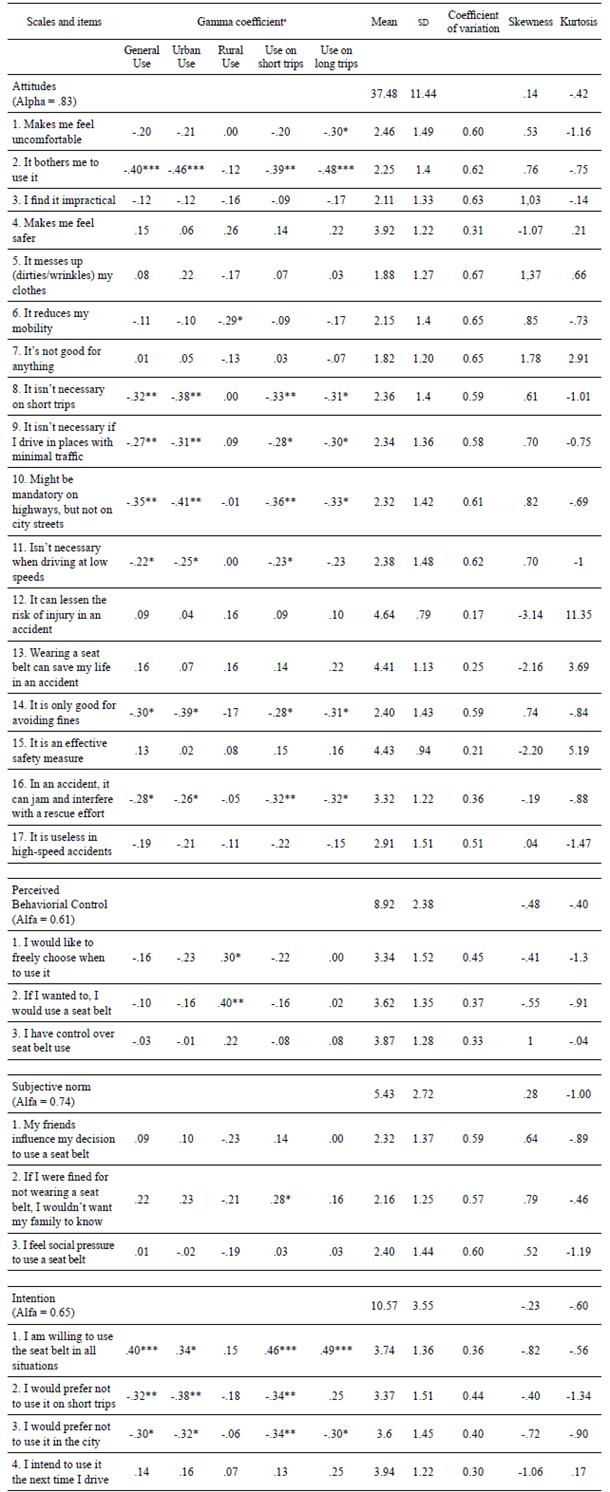 TPB Constructs. The study used instruments developed by Simsekoglu and Lajunen (2008), which were translated and adapted for Argentina by Ledesma et al. (2018). For each component of the model, an overall average score was obtained (sum of the items/number of items). Table 4 lists the items for each scale, the averages (SD) and their reliability. The study excluded two items belonging to the subjective norm scale ("People important to me would approve of my using a seat belt" and "My loved ones wish I would use a seat belt") and one item belonging to the perceived behavioral control scale ("I use a seat belt because I want to"). By excluding these items, the reliability of the instruments was substantially improved. Consequently, the final instrument contained 27 items.